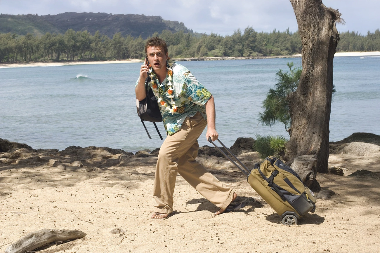 O ponto de partida é simples: um homem abandonado pela parceira famosa decide fugir para um destino turístico com a esperança de reorganizar sua própria existência. A escolha por um ambiente paradisíaco e distante não gera cura imediata; apenas evidencia o contraste entre o cenário e o estado interno de quem tenta esquecer. A quebra entre expectativa e realidade é um dos motores dramáticos da obra: tudo ao redor sugere descanso, mas nada alivia a presença constante do passado. O protagonista está rodeado de lazer, porém incapaz de usufruir do que lhe é oferecido.