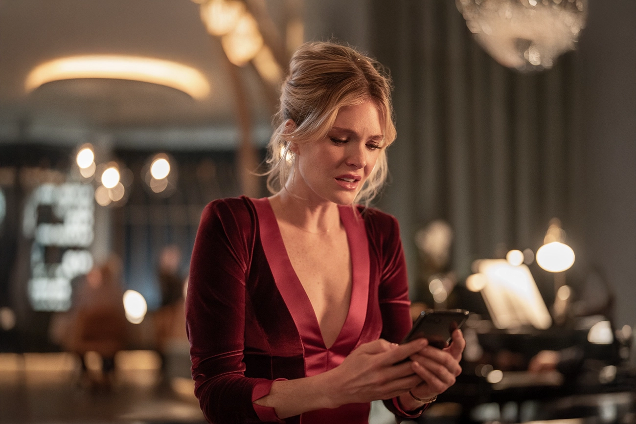 É impossível ignorar a química entre Violet e Henry. Ela revela o desejo de acreditar em algo melhor; ele encarna a promessa de cuidado. Essa conexão inicial serve como golpe emocional calculado. Quando as coisas descarrilam, o espectador sente o impacto como se tivesse sido enganado junto. Esse é um dos truques mais deliciosos de “Drop”: brincar com nossa esperança para escancarar nossa ingenuidade. Somos cúmplices do engano porque queremos que tudo dê certo, porque o amor, ou o que aceitamos como substituto dele, ainda se vende como salvação.