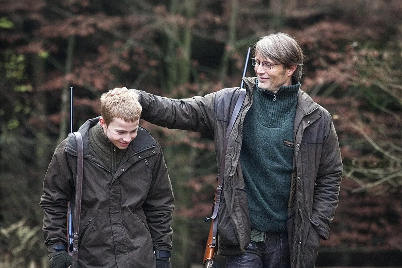 O desempenho de Mads Mikkelsen é o núcleo emocional do filme. Sua interpretação recusa o heroísmo fácil: ele não tenta convencer ninguém de sua inocência, apenas sobrevive à devastação. O rosto impassível e os olhos cansados traduzem uma dor silenciosa, que nunca se converte em fúria, mas em resignação digna. É um retrato devastador do homem moderno, incapaz de reagir diante do colapso de sua reputação, e de uma sociedade que prefere acreditar no horror a encarar a complexidade da verdade.