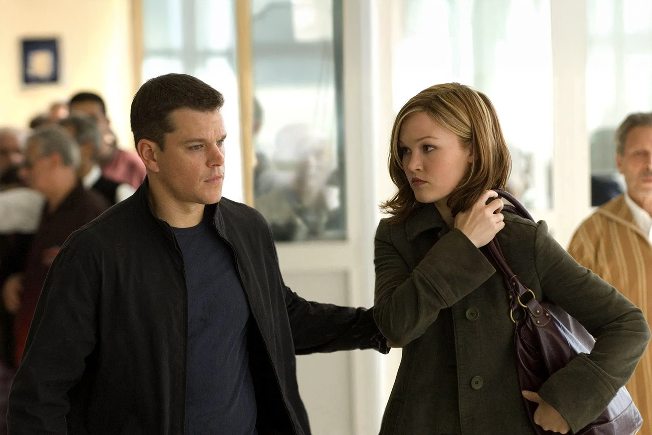 Matt Damon interpreta Bourne com economia de gestos e poucas falas, centrando o personagem em ações rápidas e observação constante do ambiente. O corpo permanece em alerta, atento a saídas alternativas, objetos que podem virar armas improvisadas e padrões de segurança de cada espaço. Nos momentos em que o ritmo desacelera, o ator enfatiza a rigidez do rosto e o olhar carregado de cansaço, sinal de alguém que começa a recordar o que fez e não consegue mais se esconder atrás da amnésia. Julia Stiles, como Nicky, ganha participação mais ampla e ajuda a sugerir uma história compartilhada de treinamento e medo, muitas vezes apenas pela forma como os dois dividem o mesmo quadro.