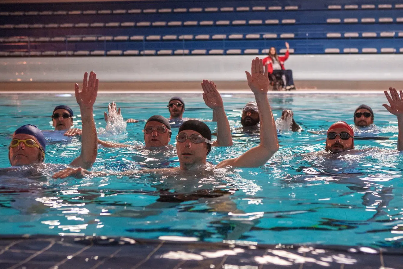 Já no dia da apresentação, o cruzamento de vidas encontra seu ponto de maior risco. Bertrand chega ao centro aquático sob olhar atento da família, Marcus e Laurent carregam preocupações de dinheiro e trabalho que permanecem sem resposta. Todos vestem o mesmo maiô, a mesma touca, o mesmo sorriso tenso. Decidem alinhar-se na borda, apesar de tudo. Do lado de fora, o público aguarda uma atração curiosa. O salto coletivo, logo em seguida, suspende o futuro do grupo dentro daquele único instante de silêncio submerso.