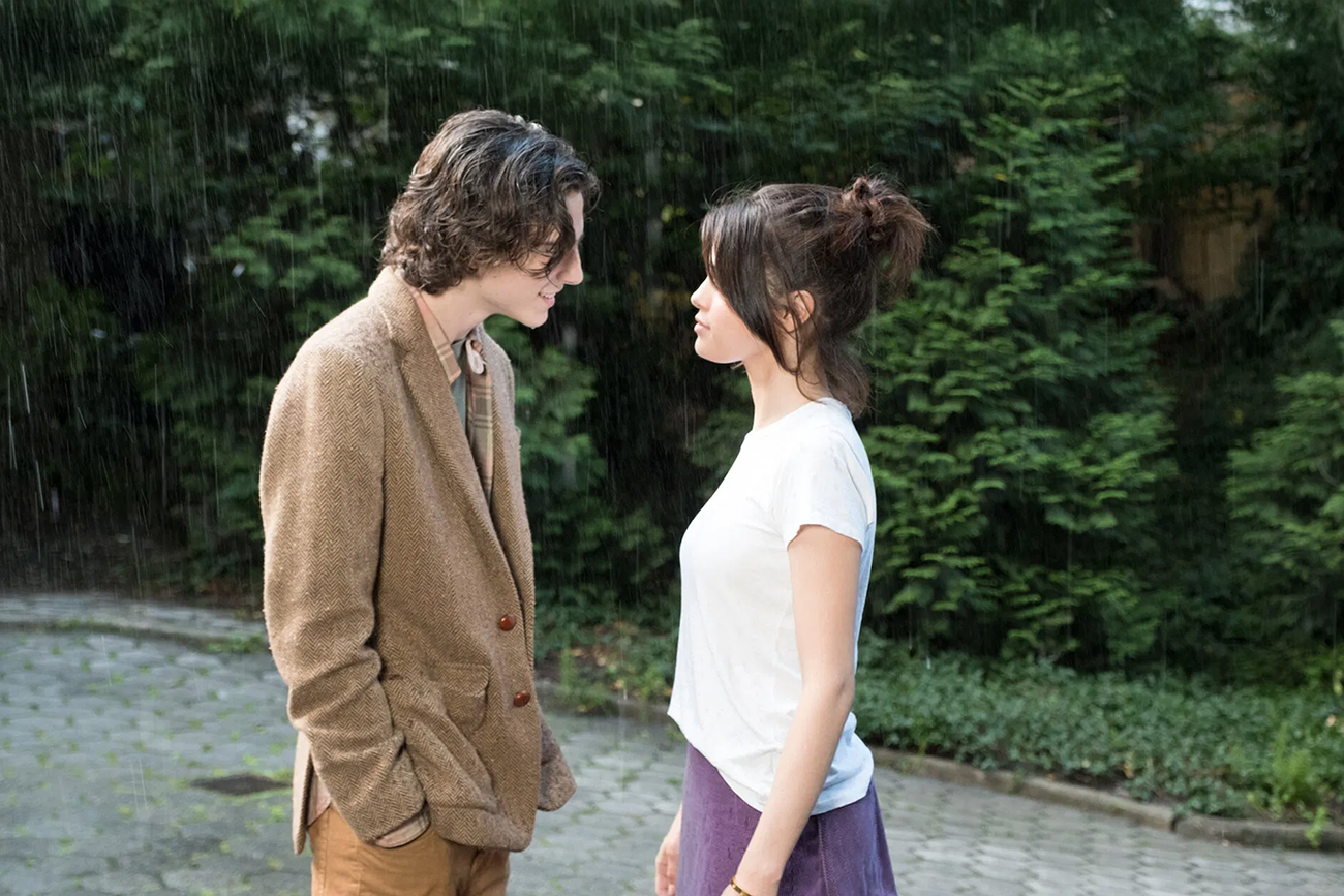 Woody Allen encadeia esses deslocamentos com cortes entre interiores elegantes e ruas molhadas, usando a chuva como medida de tempo e de humor. A informação chega sempre atrasada para alguém, e isso muda o sentido de cada decisão: Gatsby interpreta a ausência de Ashleigh como descaso; Ashleigh interpreta a insistência dele como controle. Ao cair da noite, Gatsby decide abandonar a ideia do fim de semana ideal e agir segundo o que aprendeu no próprio percurso. O obstáculo é que a escolha implica perda, porque manter a fantasia exige mentir e recuar, e admitir a verdade exige confronto. O efeito fica numa cena simples: chuva fina, um relógio marcando hora, e um jovem esperando alguém com a certeza de que a espera já mudou o que ele queria.