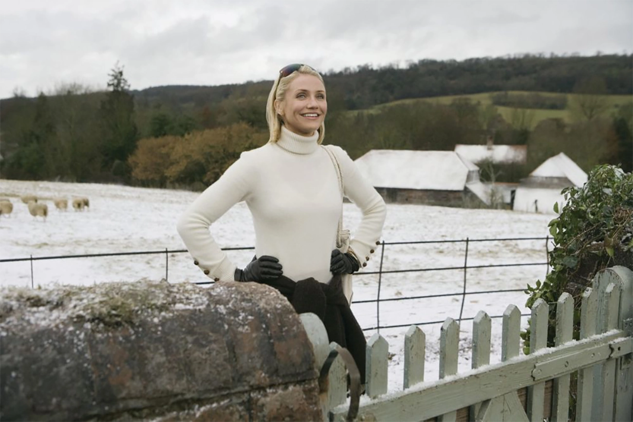 Em Surrey, Amanda cruza o caminho de Graham, interpretado por Jude Law, irmão de Iris. A química entre os dois é construída menos por diálogos espirituosos e mais por uma tensão constante entre desejo e defesa. Amanda não chora, não dorme, não se permite falhar. Graham, ao contrário, carrega uma doçura que não pede permissão para existir. A revelação de sua vida doméstica, envolvendo as filhas pequenas, reorganiza completamente o jogo afetivo da personagem de Cameron Diaz. Não há ali um truque melodramático gratuito, mas um deslocamento claro: o homem que parecia leve demais para ser levado a sério revela uma densidade emocional que Amanda nunca soube administrar. A narrativa ganha força justamente quando expõe o desconforto dela diante da intimidade real, longe de discursos românticos prontos.