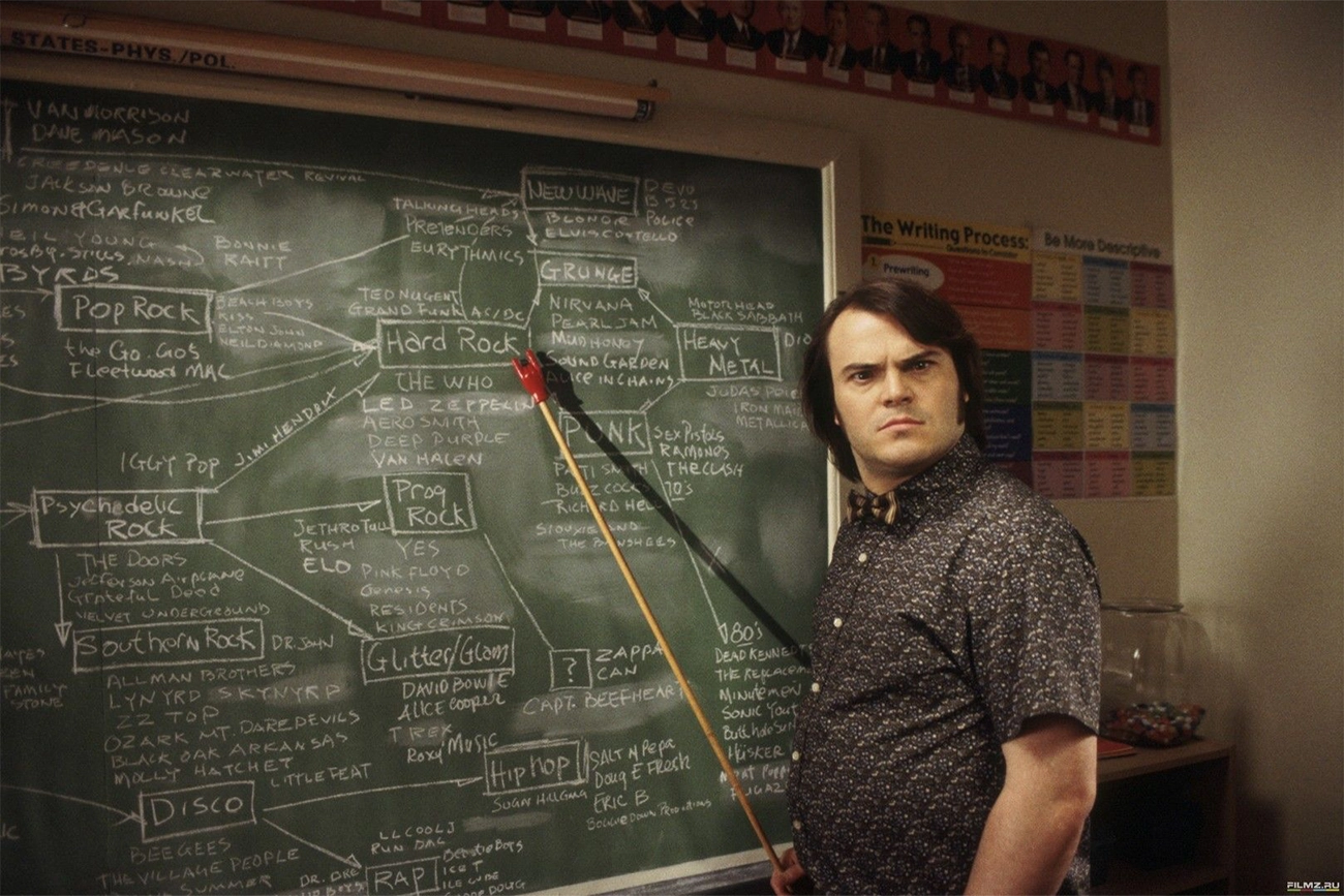 Quando Dewey decide transformar a sala de aula em um laboratório musical clandestino, o filme ganha clareza temática. Ele não está interessado em ensinar matemática ou literatura; seu único repertório intelectual gira em torno da história do rock, dos riffs clássicos e da mitologia construída em torno de figuras como Jimi Hendrix ou Pete Townshend. A transformação dos alunos em uma banda obedece a uma lógica funcional: cada criança recebe uma tarefa compatível com sua habilidade, do guitarrista ao responsável pela produção.