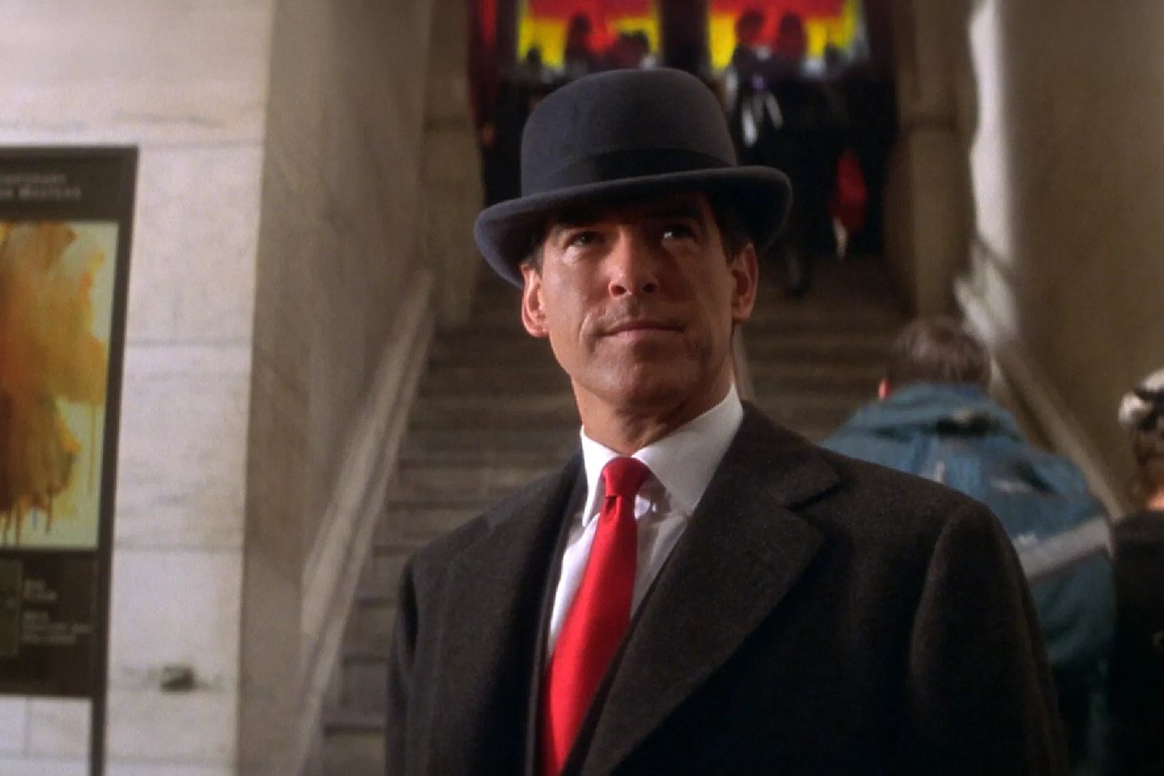 Pierce Brosnan ocupa esse espaço com controle de gesto e economia de fala. Ele caminha, para, observa e retoma ações sem acelerar. A atuação aposta na repetição: o personagem volta a situações parecidas e muda pouco, às vezes só no olhar. Essa variação pequena mantém o jogo andando, mas exige atenção do público por vários minutos, sem pausa fácil para respirar.