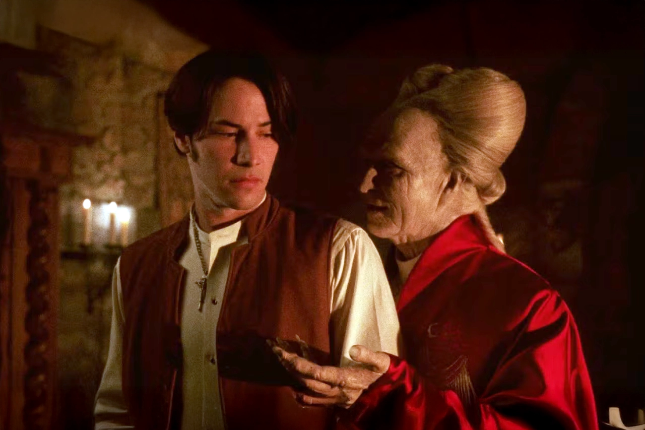 A oportunidade surge quando Jonathan Harker, interpretado por Keanu Reeves, chega ao castelo para fechar contratos imobiliários em nome de um escritório londrino. O conde enxerga nas fotografias de Mina, noiva de Harker, o rosto de Elisabeta reencarnado. A partir daí, o negócio deixa de ser apenas sobre propriedades na Inglaterra e vira passagem estratégica para Londres. Drácula mantém o advogado sob vigilância, controla sua circulação e ganha tempo para organizar a viagem. Harker tenta reagir, busca saídas, escreve cartas, mas percebe que está isolado em território que não domina. O castelo impõe regras claras, e o conde dita o ritmo, garantindo que nada atrapalhe seu plano de atravessar o mar.