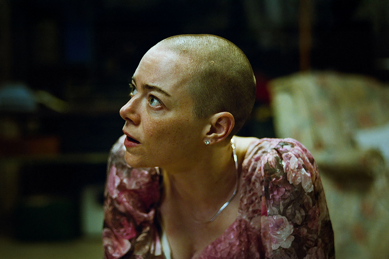 O filme fica mais interessante quando Michelle chega ao cativeiro. Raspada, acorrentada e submetida a interrogatórios num porão ou numa casa precária ligada a Teddy, ela deixa de ser apenas vítima e passa a reorganizar o jogo com frieza, cálculo e resistência. Emma Stone sabe fazer isso sem excesso. Lanthimos transforma esse espaço num campo de força entre classe, paranoia e poder, aproximando uma mulher ligada à arquitetura limpa do mundo corporativo e um homem afundado em ressentimento, colapso e crença apocalíptica. A dúvida central se instala aí, não tanto sobre alienígenas, mas sobre quem tem controle da cena a cada momento.