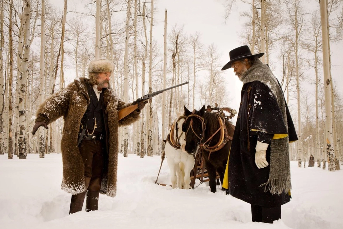 No caminho, eles cruzam com Marquis Warren, personagem de Samuel L. Jackson, um caçador de recompensas que carrega seus próprios mortos e sua própria reputação. Warren pede carona, oferece credenciais, testa os limites de Ruth. Ele fala com calma, mas observa tudo. Não entra em um espaço sem medir o terreno. Ruth hesita, mas aceita. A tempestade está piorando, e recusar companhia também tem custo.