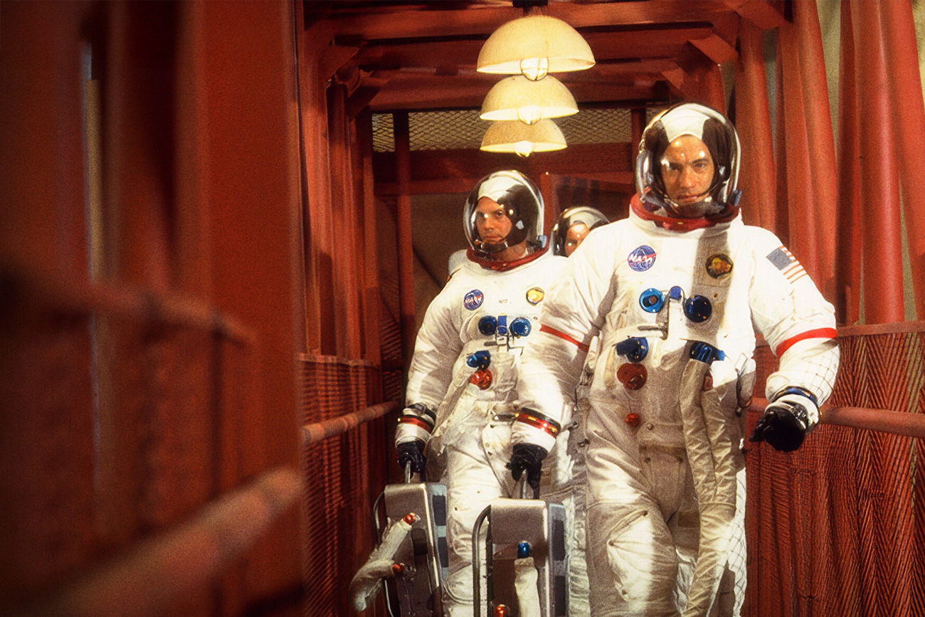 A abertura acerta ao mostrar a mudança de escala. A decolagem do Saturno ocupa a paisagem como cerimônia pública, mas o quadro logo encolhe e prende os astronautas ao interior da cápsula, onde ausência de peso, perda de calor, economia de energia e redução de água deixam de ser informação técnica e viram limite do corpo. A explosão corta essa passagem de forma seca e obriga o filme a trabalhar com temperatura do módulo, minutos de eletricidade e espaço exíguo.